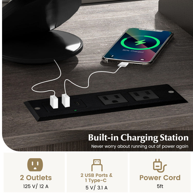 -Built-in charging station with 2 outlets, 2 USB ports, and 1 type-C port