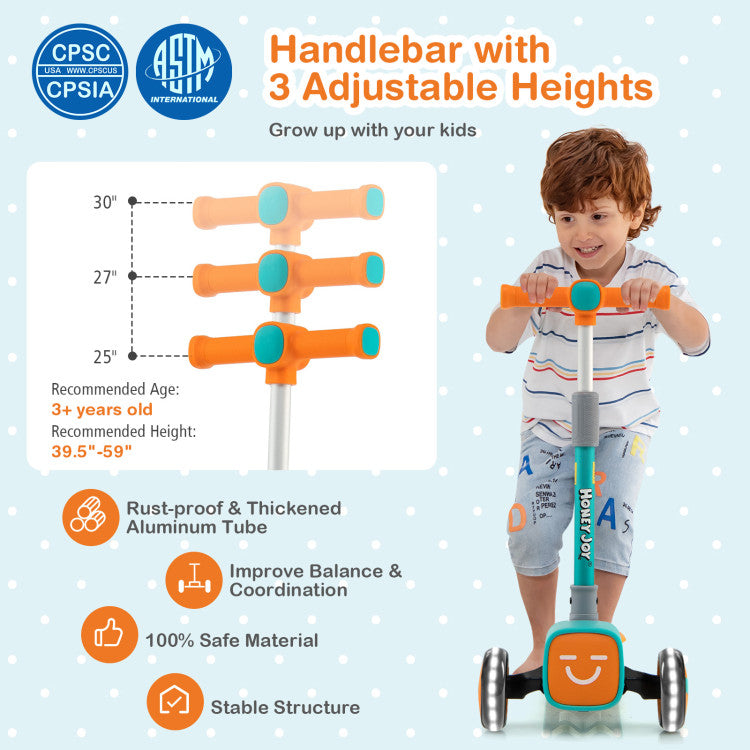 With a 3-level height adjustable handlebar, this kick scooter can accompany the growth of your child. High-strength aluminum tube frame and 100% safe PP material make the scooter stable and strong enough to support up to 110 lbs. The wear-resistant PU wheels and anti-slip deck provide a smooth and safe ride on many kinds of roads. In addition, when kids ride the scooter, the wheels will automatically light up with no batteries required. The scooter will turn in the direction where your child inclines and is equipped with a rear brake to stop it in time during the ride. 4 replaceable emoji front covers and built-in horn are designed to add more fun to the ride. What's more, the quick folding design makes this 3-wheel kick scooter easy to store and carry.