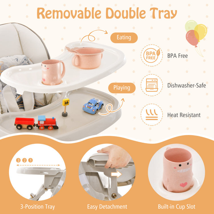 -With adjustable features like 6 seat heights, 3-level backrest, 3-gear footrest, and removable double trays, your baby can sit comfortably and more enjoy meals.