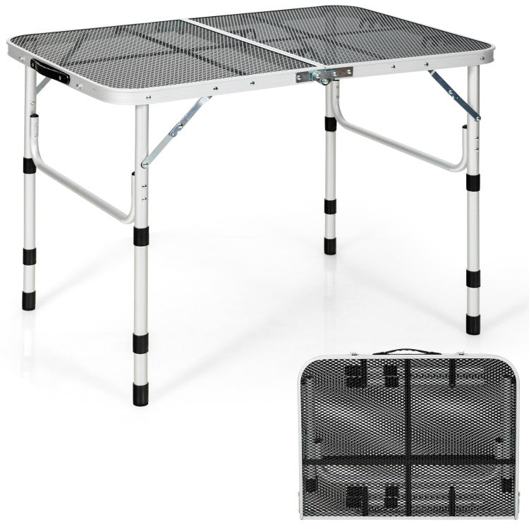 Comes with aniron mesh tabletop, the picnic dinging table can ensure great support and dissipate heat well.And its aluminum frame with excellent sturdiness can load up to 110 lbs. What's more, the anti-skid foot pads enhance using safety. So you can put all stuff on the table without worrying about accidentally tipping over. The camping table has 4 different heights for you to choose by adding or reducing the leg tubes. And this outdoor camping table is foldable for effortless carrying and space-saving storage. Compact briefcase size with side carrying handle allows you to take to anywhere possible. Specially designed for outdoor activities, the folding grill table facilitates the prepare for camping.