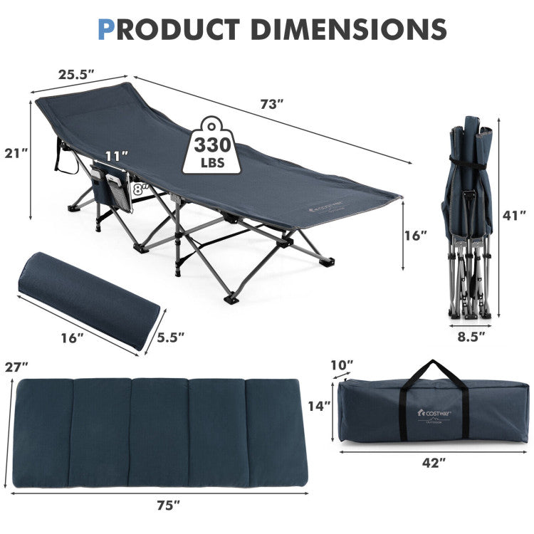 The folding camping cot measures 73” x 25.5” x 21” (L x W x H) and loads up to 330 lbs, which provides a large sleeping area ensuring single-person free movement in use. More importantly, the outdoor sleeping bed comes with an ultra-soft mattress with exquisite stitching, which is covered with comfortable velvet allowing you to enjoy superior relaxation and comfort. And you can remove the mattress and pillow lying on the breathable fabric surface, and it is made of premium oxford fabric, which is wear-resistant, tear-resistant, and waterproof, ensuring a long service life. Thanks to the 10-point supporting frame, the camping bed is sturdy, durable, and not easy to wobble when used outdoors. Besides, it can also be folded into a compact size and stored in the carrying bag, which would not take up much space and is easy to transport. Why not get this multifunctional sleeping cot to meet your indoor and outdoor rest needs?