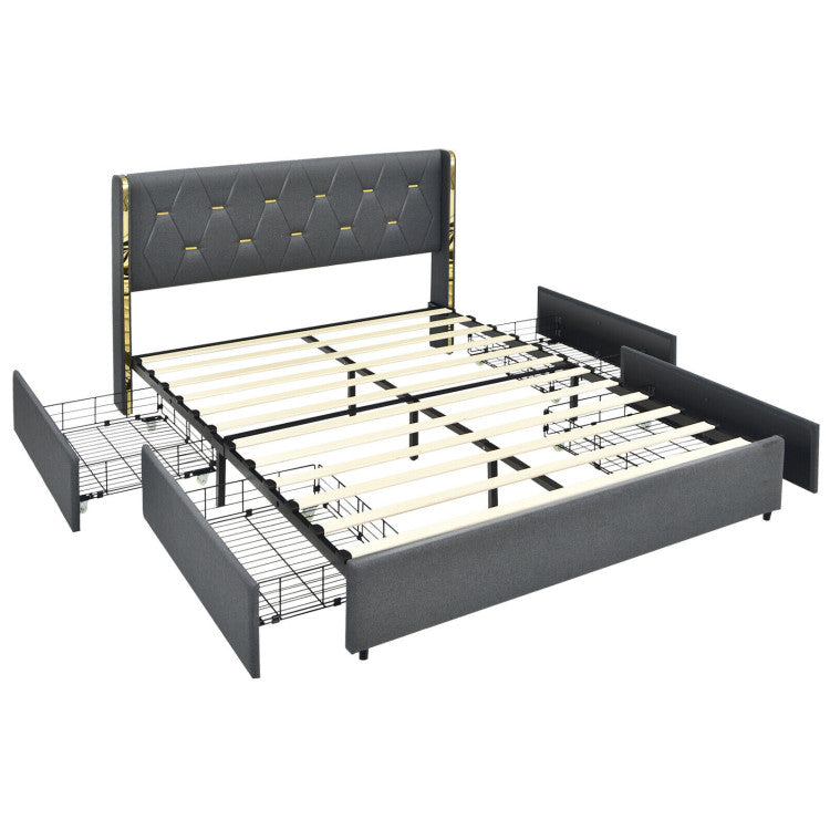 The bed frame is fully filled with sponge and covered with linen fabric which highly improve the softness. Also, it has four large rolling drawers where you can store many clothes, bed sheets, toys, pillows and so on. The whole frame is made of steel and it also comes with ample slats, both realize a strong load capacity of 660 lbs as well as sufficient support for your mattress without a box spring. As a reminder, the recommended thickness is 8”-12”. When you lie on it and turn over, you will find there is few noises. Because an included mute bar greatly reduces frictions between slats and frame. Anti-slip and adjustable pads enhance overall stability for a wobble-free position. Finally, you can install all slats only by your hands, saving much time and effort.