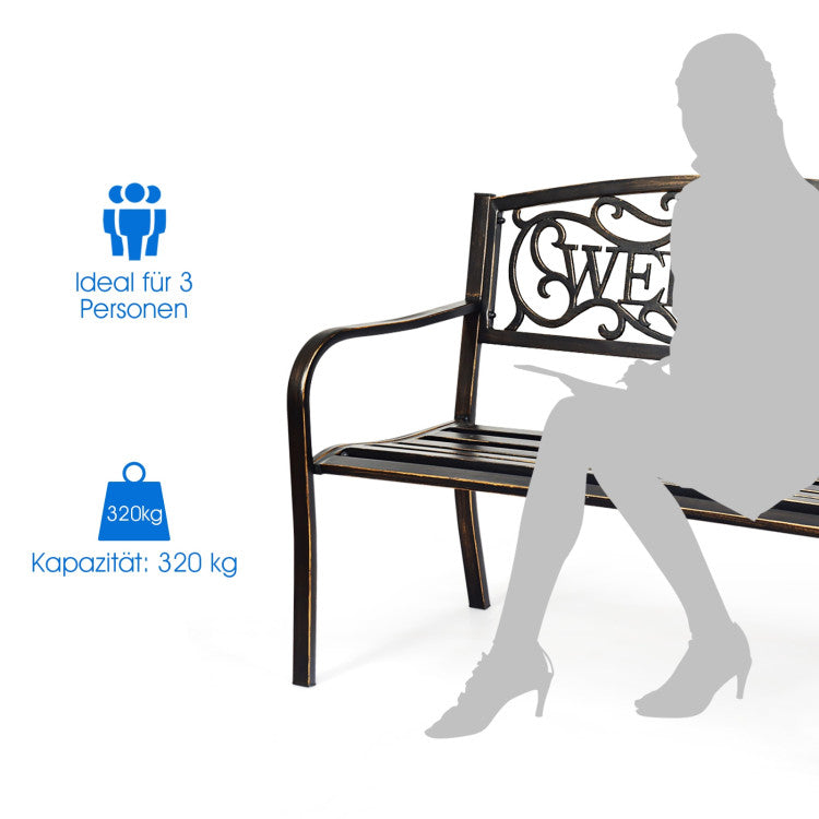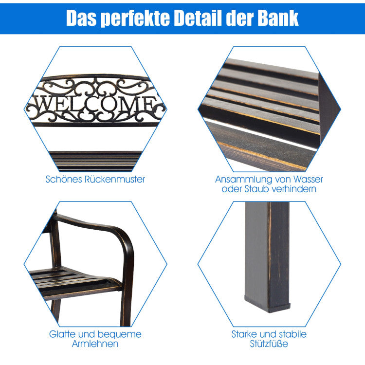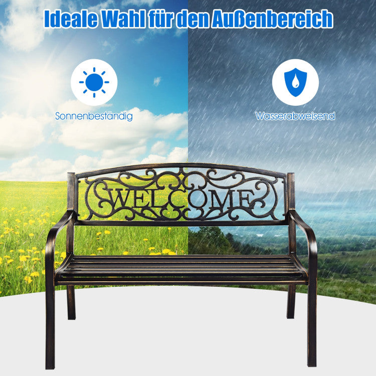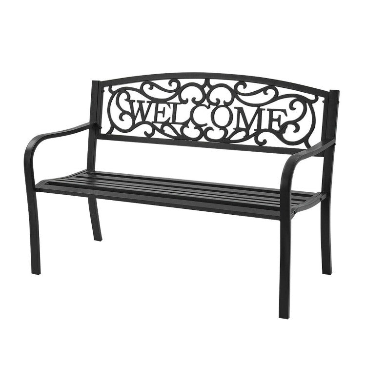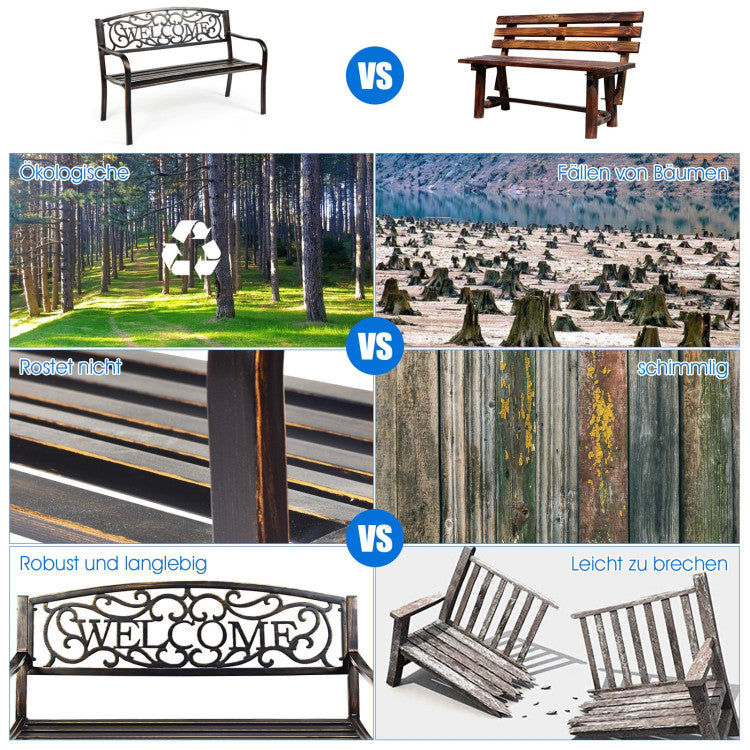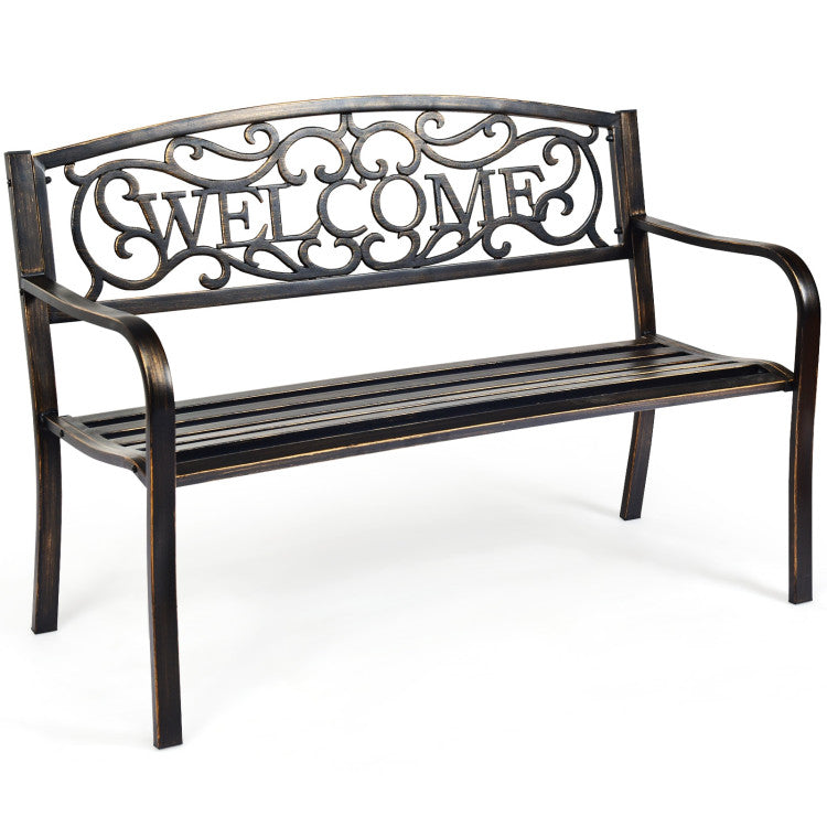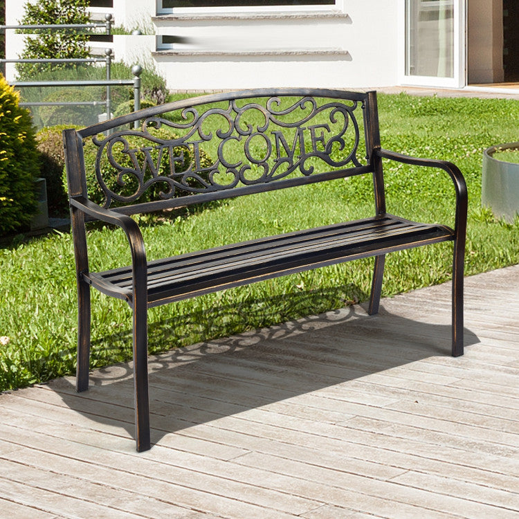 On seeing the "welcome" carved on the backrest, your family and friends will surely feel warm and relaxed. With an armrest and seat board fits your body line, you and your family can sit on the beautiful bench comfortably, enjoying the peace and natural beauty. Crafted with durable metal frame and fine coating, this park bench is able to withstand all weathers for your long-time use.
