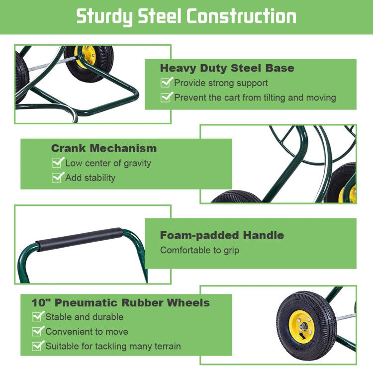 Made of excellent steel construction, it is durable and sturdy to use. Max to hold 200 feet of 3/4" hose, two durable big 10" pneumatic wheels to tackle many terrain for smooth move. You can easily wind hose into this cart with crank mechanism. Your hose will be ready to use at any time and kept clean. It is perfect to suit garden or landscaping needs for professional, commercial or home level.