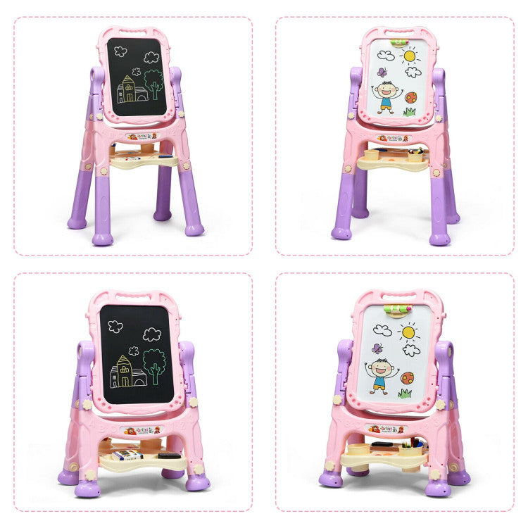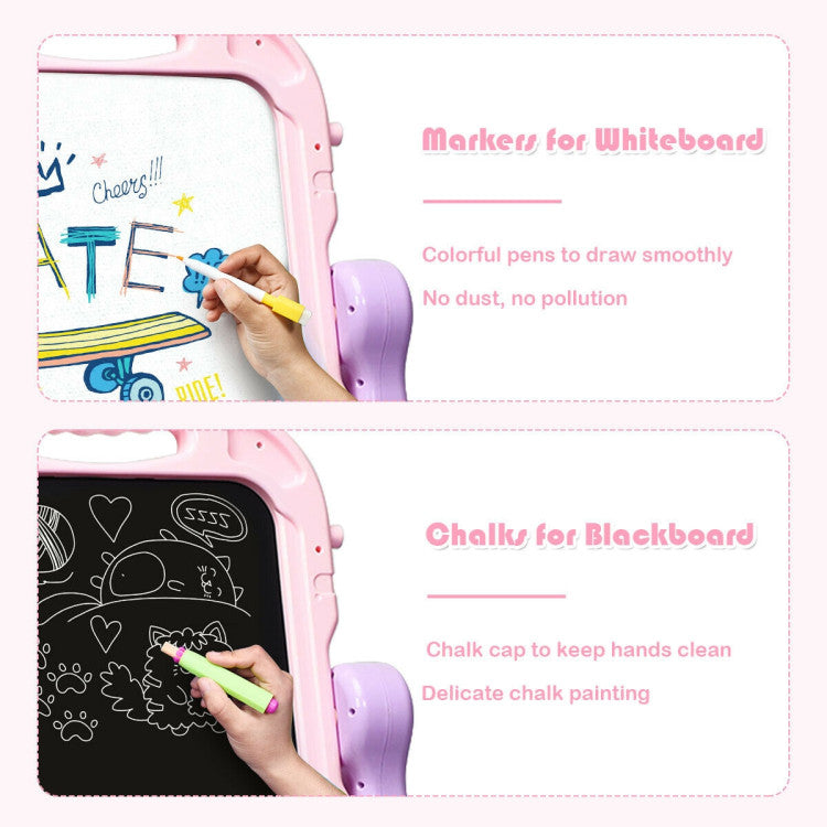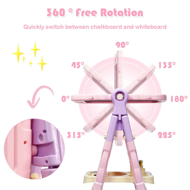 Equipped with a magnetic whiteboard and chalkboard, the young artists can draw with his/her best friend to promote friendship. 360° rotating design allows kids to switch freely and add more fun.