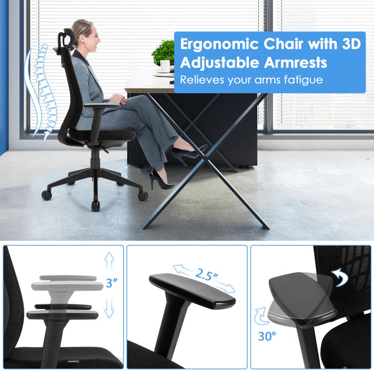 The rotatable headrest allows you to find a perfect position to support your neck well. The reclining Angle can be adjusted from 90°to 105°for different purposes. And you can also adjust the 3D adjustable armrests according to your working postures. Also, 5 casters and 360° swivel seat can provide you with a dynamic working condition.