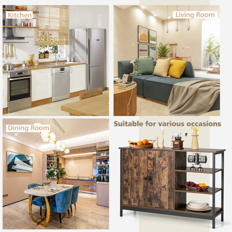 Made of a durable board and robust steel frame, this buffet cabinet boasts superior durability and stability to withstand years of time. The storage cabinet provides sufficient storage space to keep your home organized. A spacious tabletop can display decorations, 3 shelves allow you to classify books orderly, and a 2-door cabinet with a 3-position adjustable shelf offers customized space to accommodate items in different sizes. This functional cabinet not only works well as a buffet sideboard, but also serves perfectly as a coffee bar cabinet to serve your leisurely afternoon, a console table in the hallway, or a storage cabinet to tuck away your overflow in the living room as well as the bedroom. No matter in the living room, hallway, or kitchen, this side cabinet with a touch of industrial sense will perfectly blend in.