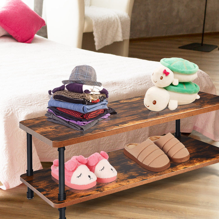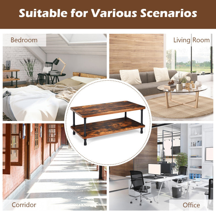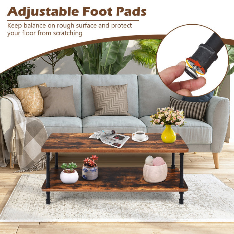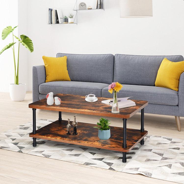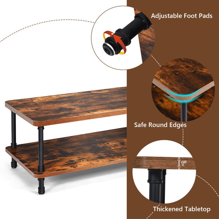 Double-layer design provides large storage space for daily use. The 43.5" x 23.5" tabletop is ideal for placing vases, fruits and snacks, while the bottom shelf offers extra storage space for magazines, TV remote controls, and other sundries. Characterized by its rustic brown tabletop and black bare steel legs, this cocktail table will perfectly match any retro or industrial room layout. It can be either used in your living room as a tea table, or in the bedroom as a TV stand. Combining the aesthetic value and practicality, this retro coffee table must be an eye-catching addition to your home decor.