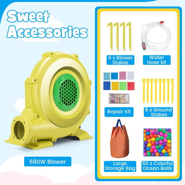-Package Includes: 1 x Bouncing Castle, 1 x 680W Blower, 4 x Blower Stakes, 1 x Water Hose Kit, 1 x Repair Kit, 8 x Ground Stakes, 1 x Storage Bag, 50 x Colorful Ocean Balls, 1 x Instructions