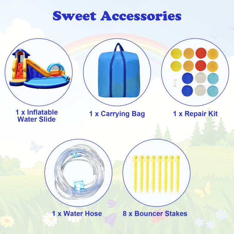 Shark-Themed Water Park: With shark design, this bounce house comes with a slide, a climbing wall, a water gun and a splashing pool. It is suitable for 4 kids who weights under 100 lbs each to play together. Quality Materials for Safety: This inflatable jumping castle is made of puncture-resistant 840D and 420D Oxford material. The top bounce area is surrounded by mesh walls for safe playing. Enjoy the Summer Joy: This inflatable bouncy house can be used as a water park through the water hose. It is a good choose for kids to pick a variety of pleasures in this water park. Effortless Assembly: This water bouncer blows up in minutes with a 680W blower (not included) and can be deflated through the air outlet tubes. Easily setting up and taking down. US. CPSIA and ASTM Approved: Made of non-toxic material without any odor, Free from BPA, PVC, Phthalates, Lead, Latex, and Formaldehyde. No sharp points or edge. Passed the tests of stability, asphyxiation, load and shear.