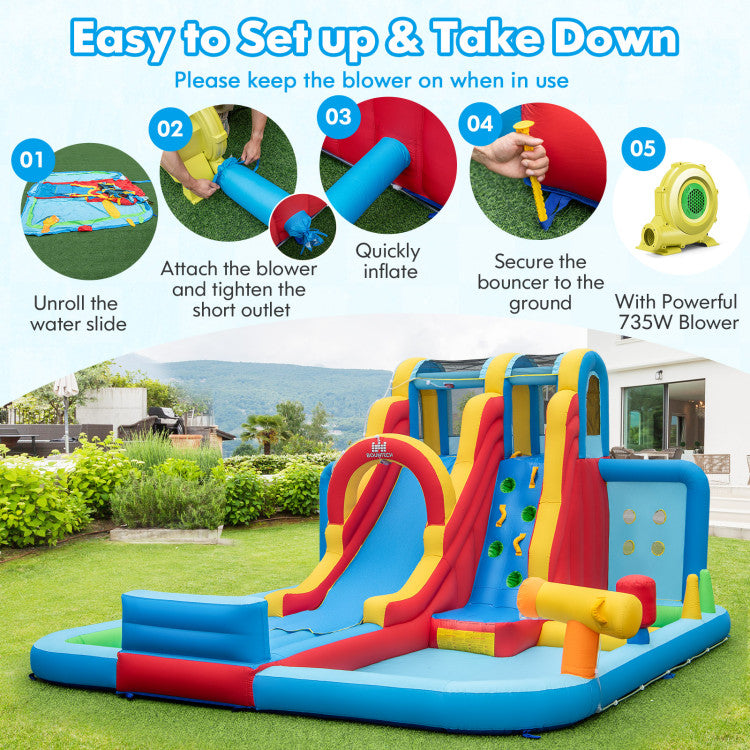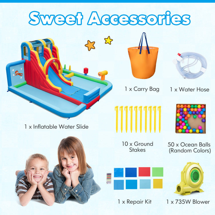 -Package Includes: 1 x Inflatable Water Slide, 1 x 735W Blower, 1 x Carry Bag, 1 x Repair Kit, 1 x Water Hose, 10 x Ground Stakes, 50 x Ocean Balls (Random Colors), 1 x User Guide