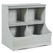 It's a good tool to teach children to arrange and classify their own things. Constructed with durable and environmental friendly MDF board, this multi-bin storage organization is child-friendly and durable. Featuring 2 cubbies and 2 bins, this bookcase canstorage and classify different things, whatever books or toys.The top has bearing capacity of 66 lbs. Each bin can hold up to 22 lbsand each cubby can hold up to 33 lbs. Other than that, humanized name card design in the middle of the shelf prevents your kids from mixing up toy cabinets at school and kindergarten.