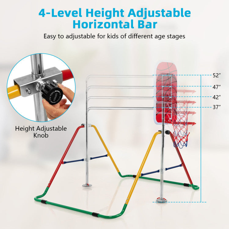 This indoor gymnastics equipment combines a horizontal bar and a basketball hoop, offering endless fun to kids and promoting growth during happy exercise.