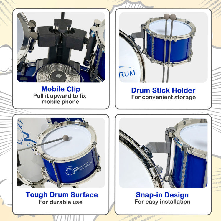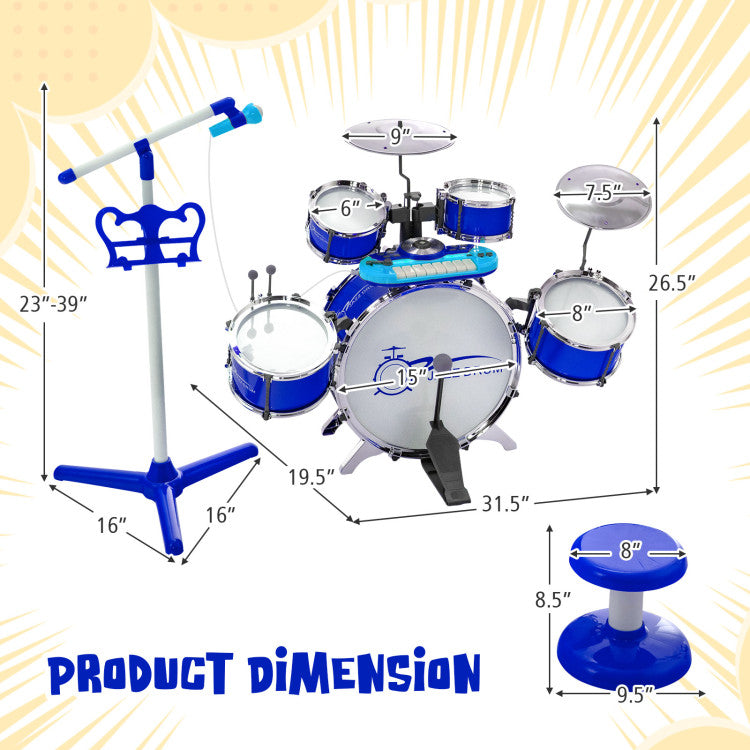 -A drum set, 8-key electric keyboard, microphone and stand, stool, MP3 cable and 2 drum sticks included