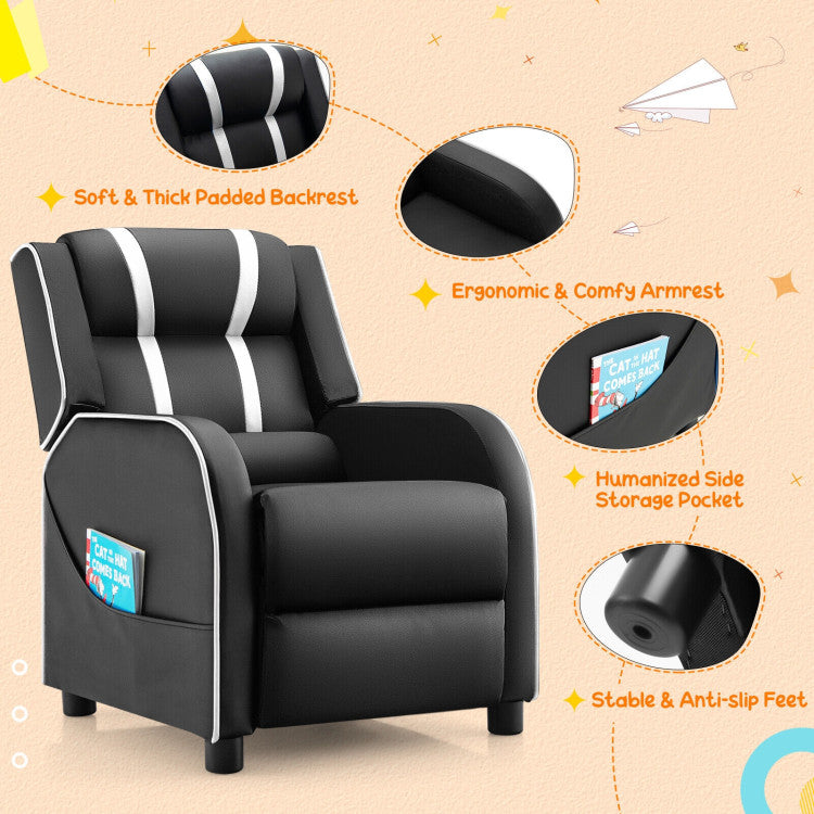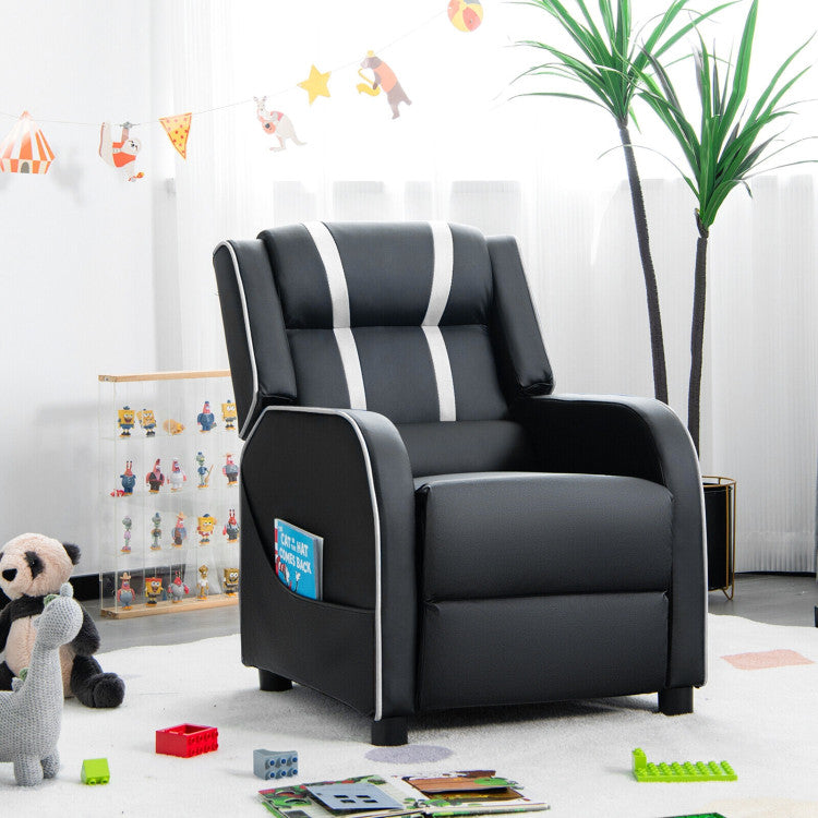 Designed with an adjustable backrest and footrest, this kid's recliner can meet multiple needs. Kids can sit up straight to watch TV or read books, or lie down to take a nap. Filled with a high-resilience sponge and covered with skin-friendly leather, this armchair sofa provides a super comfortable sitting experience. Besides, the PU leather cover is smooth and waterproof for easy cleaning just with a damp cloth. 2 side pockets offer convenient storage for kids' favorite books, snacks and more. The solid wood and steel frame make this kid's recliner chair sturdy enough to support up to 110 lbs. Moreover, 4 anti-slip feet are equipped to keep the recliner chair in place for added stability and security.