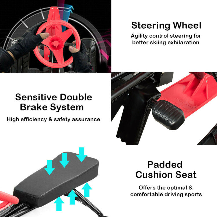 This sledge is equipped with foot brakes, a steering wheel and a steeling column to ensure steering doesn't override. Double brake design allows you to brake at any time during skiing to protect your safety. Front-upturned skis can evenly distribute the impact force to prevent the occurrence of safety accidents. Durable steel frame and freeze-proofing hdpe material ensure that it can accompany you for a long time.