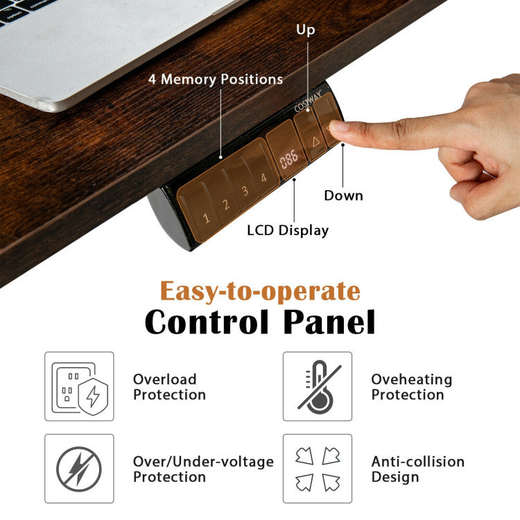 Its whisper-quiet motor can achieve 17" height adjustment at a speed of 0.8" per second, saving your effort and avoid disturbing others. It is also worth mentioning that the anti-collision technology will help prevent bumps or scratches during the lifting process. To facilitate your operation, the standing desk is equipped with a convenient touch panel with LCD display. You can customize 4 personalized positions with the memory setting. In addition to height adjustment, the computer desk also boasts its space-saving L-shaped appearance and solid construction. The large desktop that supports up to 210 lbs can accommodate your office supplies. Together with 2 hooks, it will give you a spacious and tidy work surface. What's more, you can fit the base with adjustable foot pads or lockable rolling casters according to specific needs.
