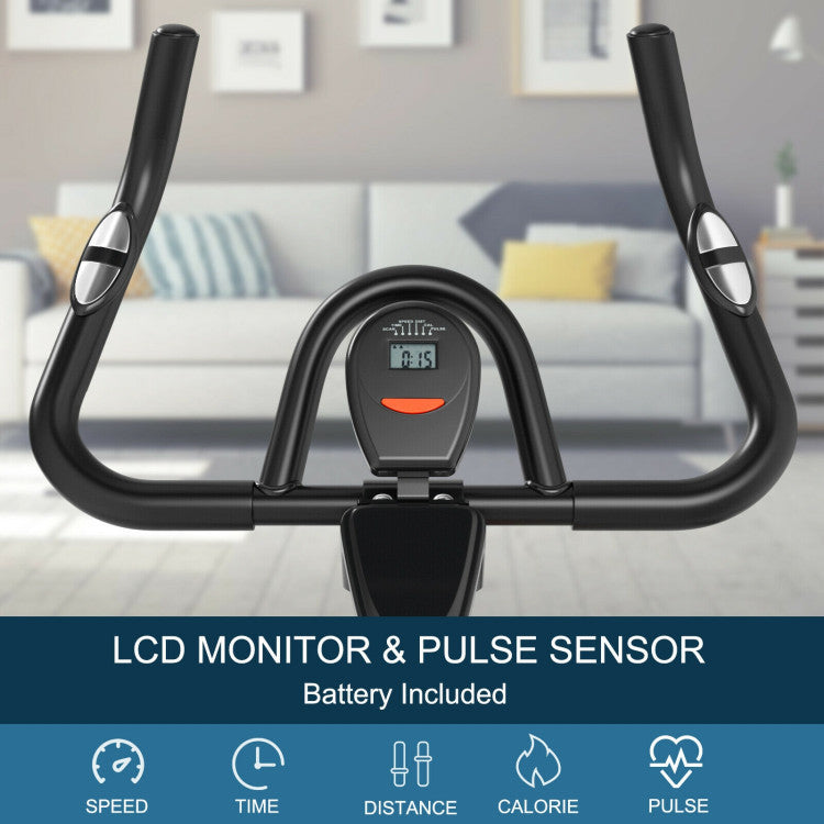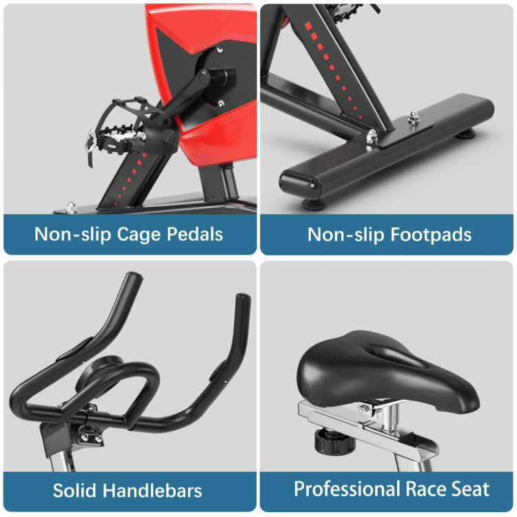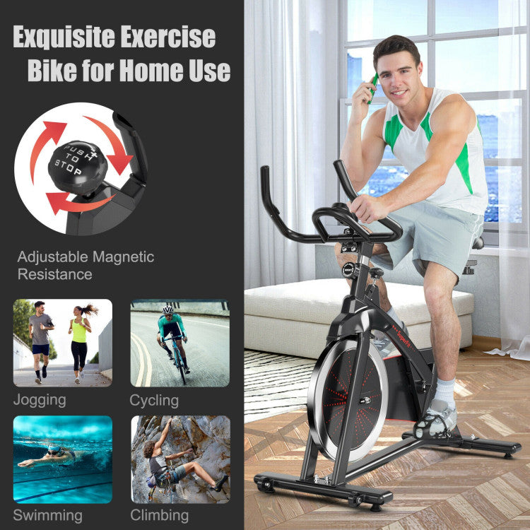 The 35lbs flywheel offers a smooth spinning ride and a quite exercise environment. And the controlling knob can be used for magnetic resistance adjustment and emergency stop as well. In addition, heavy-duty steel frame and anti-slip foot pads ensure high stability, durability and safety. The exercise bike is suitable for all people as its seat cushion and handlebars can be adjusted into multiple positions, so you and your family all can enjoy a healthier lifestyle with this magnetic exercise bike.