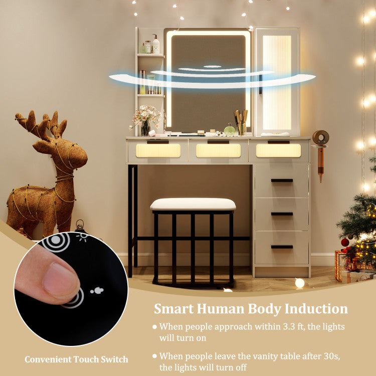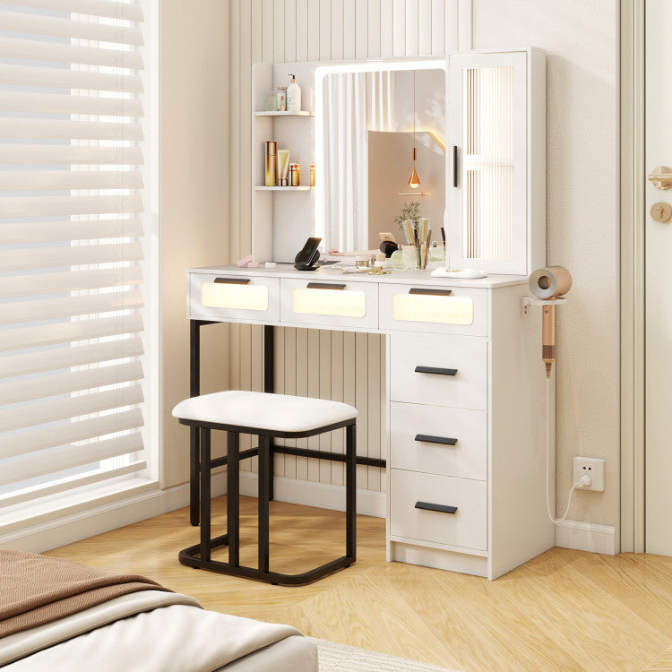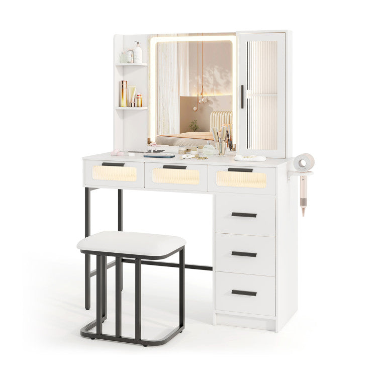 -Ample storage space with 6 drawers, a cabinet and a hair dryer rack