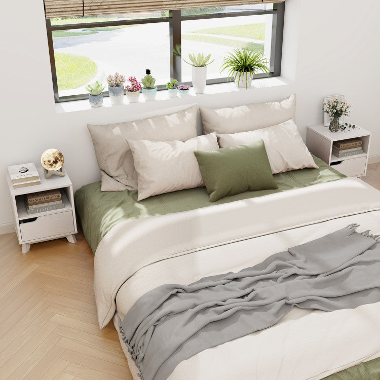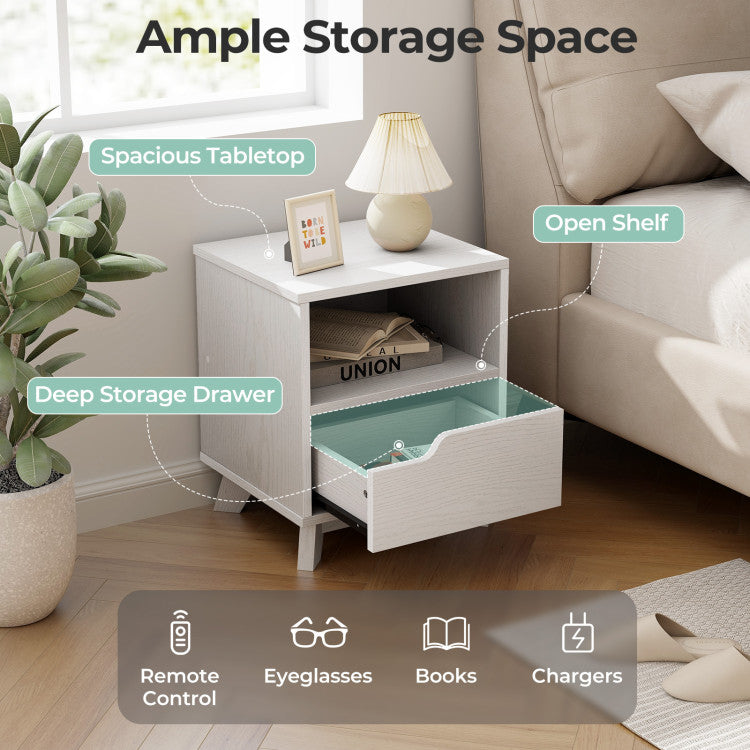 -Equipped with a storage drawer and shelf for bedtime essentials