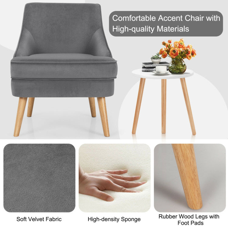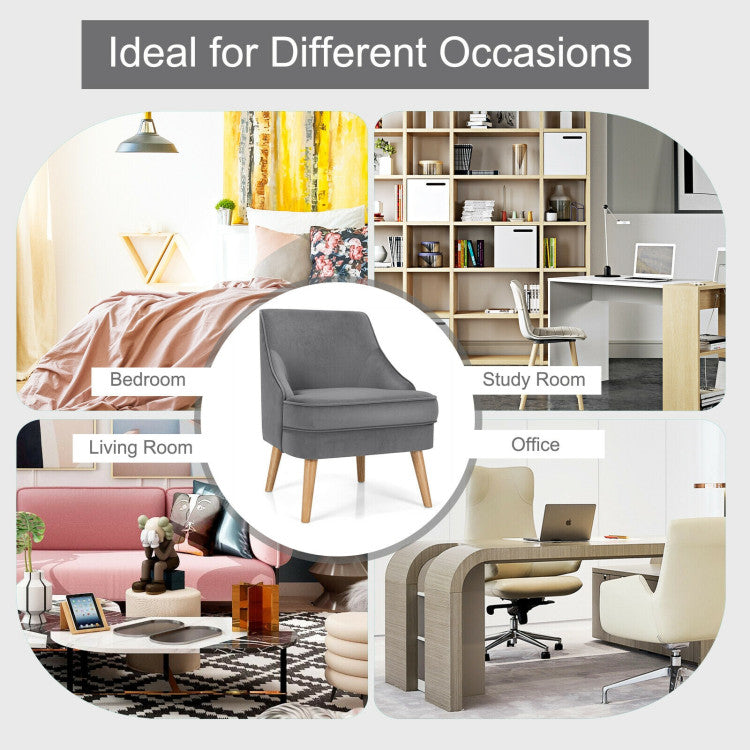 Constructed with a pine wood frame and rubberwood legs, this accent chair is durable and stable with a strong weight capacity of 265lbs. Besides, non-slip pads protect the floor from scratching. With a high-quality velvet cover, our chair has a beautiful appearance and soft touch. Ergonomic backrest and thickened seat cushion offer you ultimate comfort. In addition, a modern and elegant appearance enables you to place it in your living room, bedroom, and dining room. You can use it as a vanity chair or a dining chair according to your different needs. Thus, you can freely enjoy your leisure time wherever you like. Additionally, with detailed instruction, it is easy to assemble and maintain.