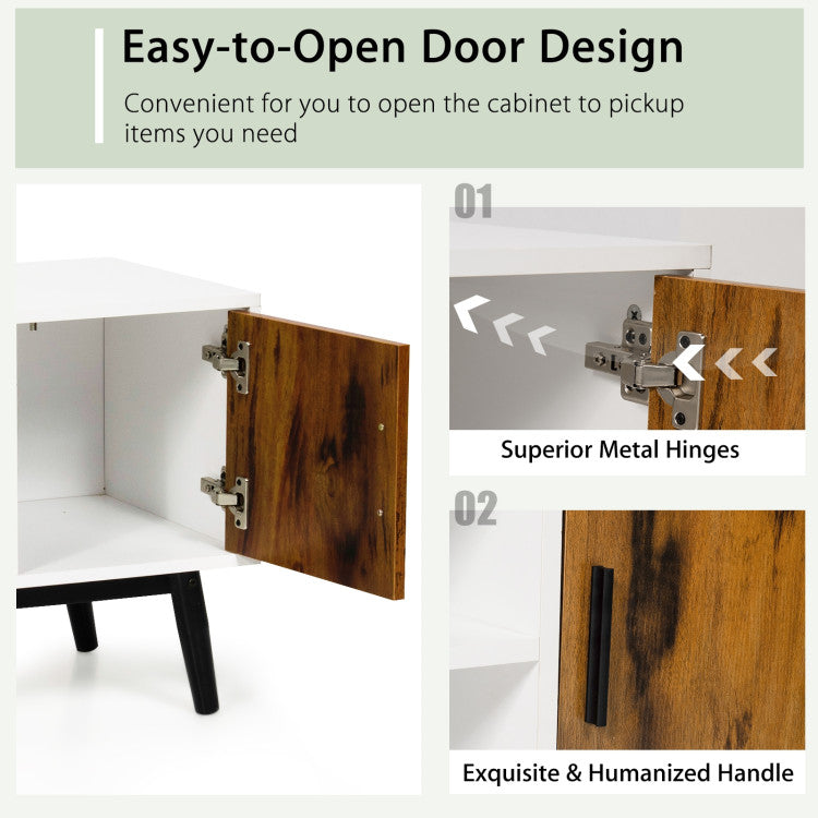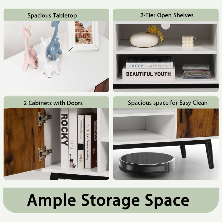 This console table is versatile so that you can place it in your living room, bedroom, entryway, office and more. It will be a wonderful ornament that brings your home an elegant and retro charm. The spacious tabletop fits up to 55" flat screen TVs and can perfectly hold various decorative items. 2-tier open shelves and 2 cabinets provide ample space to store your audio or video component equipment. Moreover, the superior metal hinges and humanized handles allow you to easily open and close the doors with low noise. As for quality, made of thick MDF and sturdy metal leg frame, this TV cabinet is stable and durable to support long-lasting use. Non-slip foot pads can protect the floor from scratching and enhance the overall stability. What's more, the cable hole in the back of the TV stand helps to organize wires effectively.