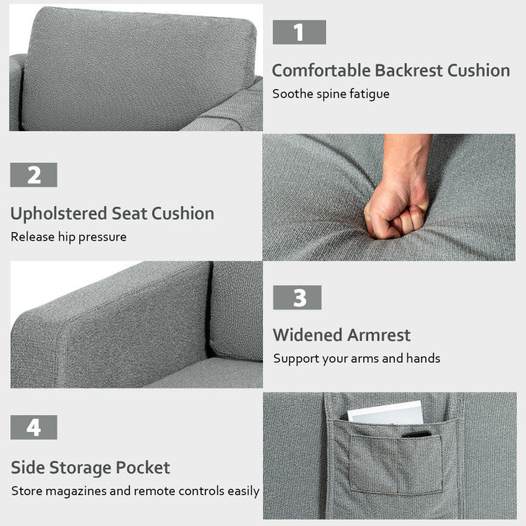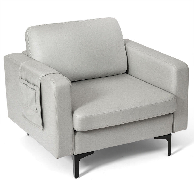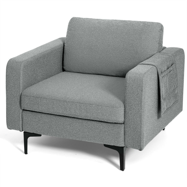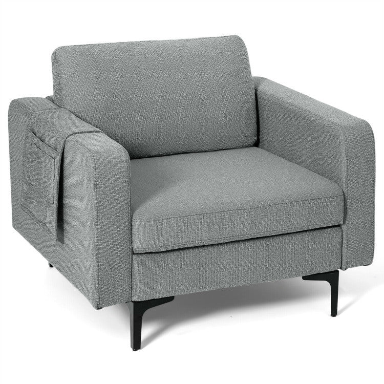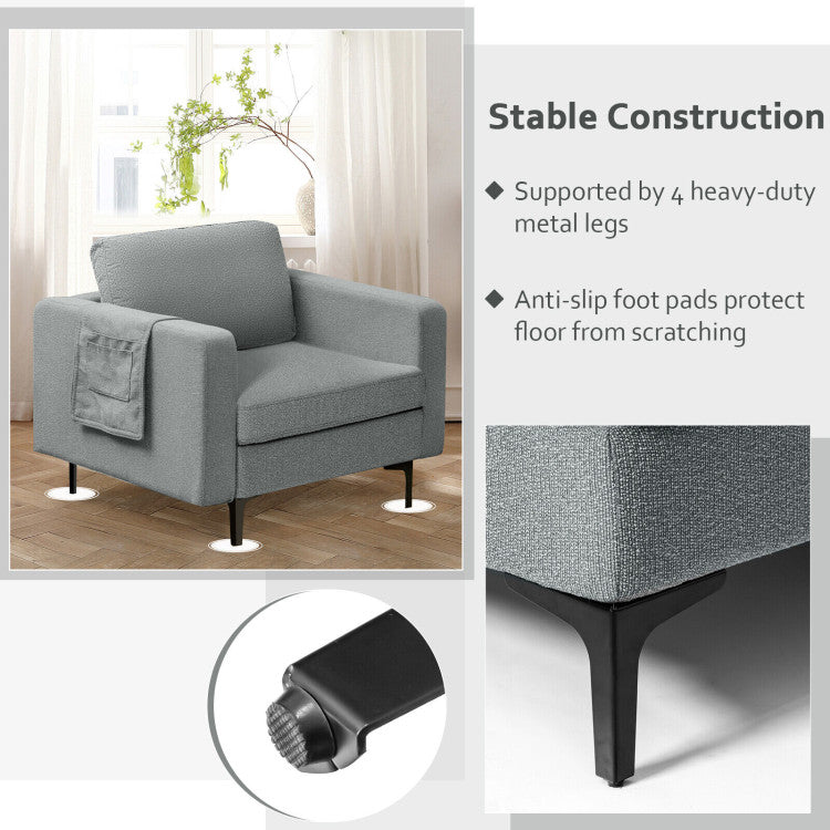 Featuring ergonomic and comfortable design, this single sofa chair can deeply release your fatigue after a tiring work day. The high-resilience sponge and original distributed elastic system provide long-lasting elasticity and softness. What's more, the solid wood, robust metal and non-slip foot pads endow the sofa with high loading capacity and stability. You can put magazines and remote controls in the side storage pocket for easy access. If the cushion surface is smeared, you can detach the cover to clean.