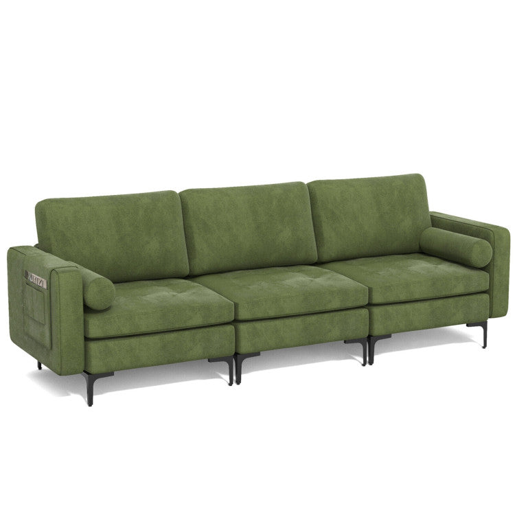The couch is made of skin-friendly suede fabric, allowing for excellent breathability, dirt resistance and crease resistance. Meanwhile, seat cushions with sponge filling, padded back cushions and sponge bolsters make it soft and comfortable. With an ergonomic backrest, it features a 103-degree reclining backrest angle. You can sit, lean on or lie down on it for relaxing. What's more, beautiful backrest lines make it a real eye-catcher in your living room and an extra side pocket offers more storage. A solid frame, strong metal legs and non-slip pads keep it strong, durable and stable. And removable seat cushions, backrests, bottom frames, armrests and side pockets help you to freely combine them into different shapes.