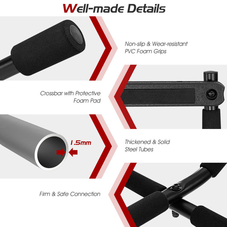 You can simply hang this pull-up bar in any doorway in the home, and grab the handles to do a variety of upper body exercises. There are 3 grip positions for you to choose: narrow, wide, and parallel. In addition, this doorway pull up bar can also be used on the ground to meet your different workout needs, such as the sit-ups, dips, push-ups and more. The handles are all covered with non-slip and soft PVC foam, which can bring you a more comfortable and secure workout. Made of heavy-duty and powder-coated steel tubes, this door frame chin-up bar ensures long-lasting use and strong load capacity of up to 330lbs. All in all, this multifunctional and practical doorway pull up bar will be a perfect addition to any home gym workout.