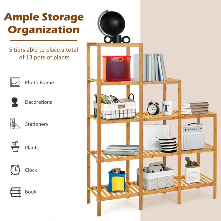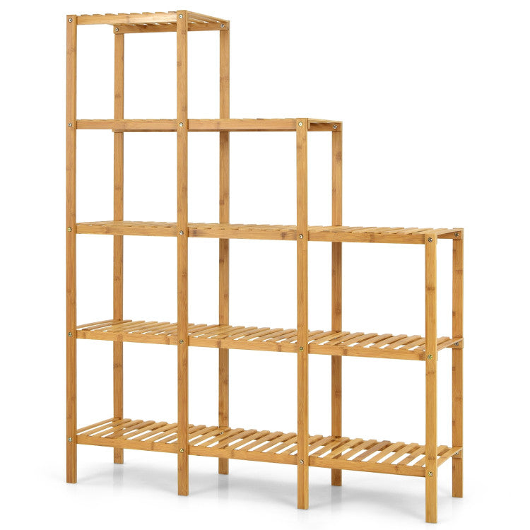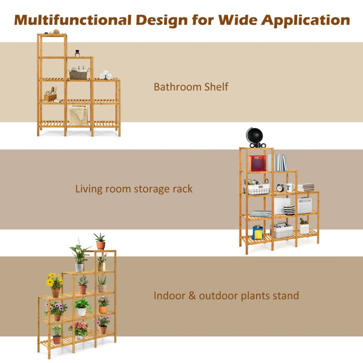 Environmental Material: The material of this item is natural bamboo. It would not produce harmful gas and could provide you healthy usage experience. It's very environmental. Good Storage Capacity: Four tiers and nine lattices for your plenty storage requirement. It could classify your things into many types. It's your good partner to organize your staff. Solid Structure: This shelf is made of solid bamboo construction. Structured with heavy-duty wood for extended durability, and the structure follows the scientific principle and is strong enough to hold books, magazines and other things. It's sturdy and solid for long time and durable usage. Easy To Assemble: This product has straight forward illustrations and descriptions. Every screw and pin has its own code and it's easy to understand the assemble progress. It won't take you much time and could save your energy. Perfect Detail Workmanship: High quality corner connecting procedure which could make this shelf more durable and solid. And the structure follows the scientific principle and is strong enough to hold different things.