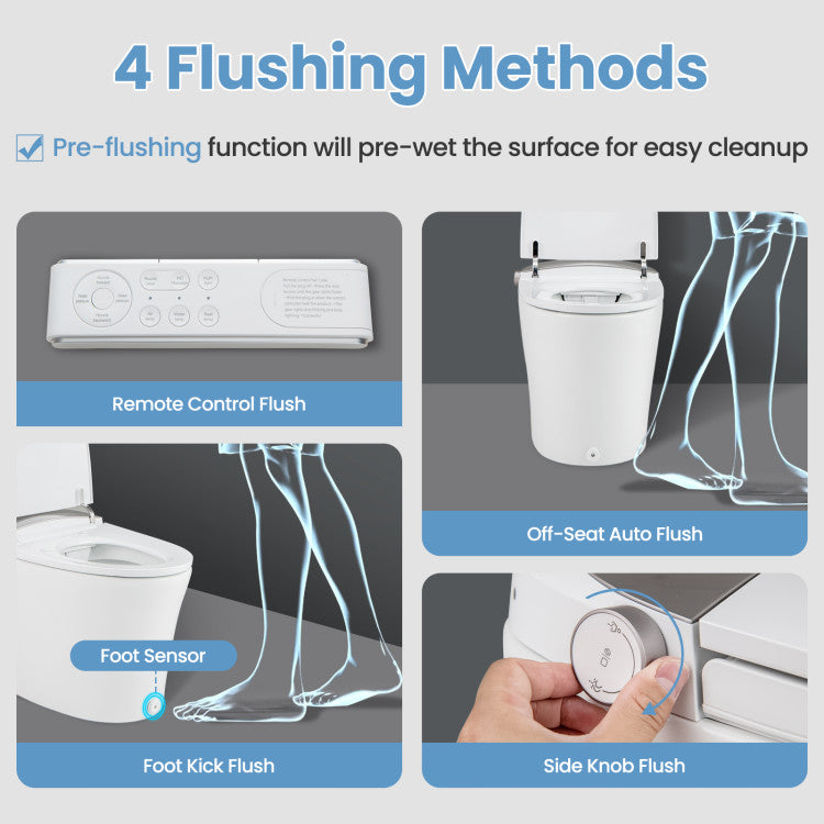 This smart bidet toilet features four advanced flushing options: off-seat auto flush, foot kick flush, remote control flush, and side knob flush. Additionally, the side knob can be used to flush during power outages, ensuring uninterrupted functionality.