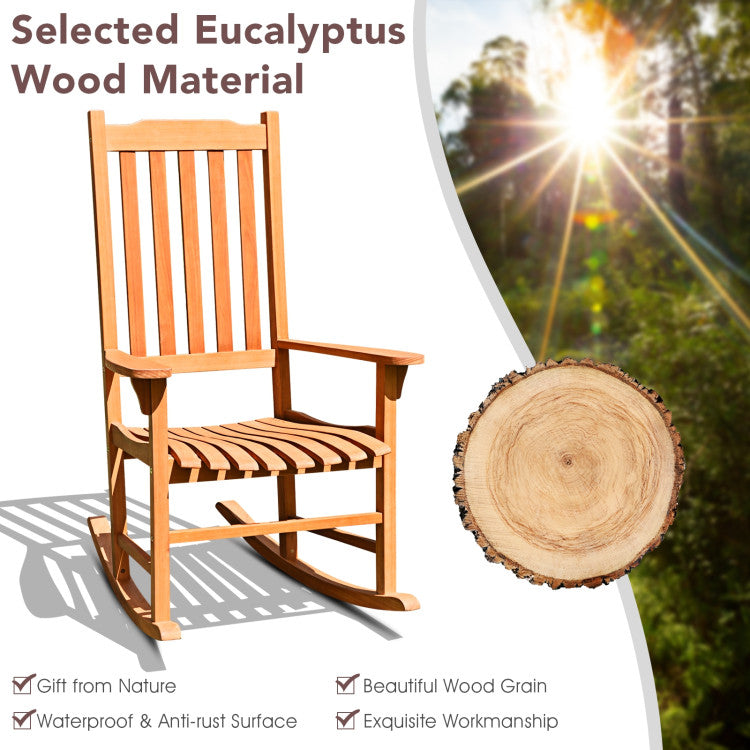 The image of you is drinking a cup of tea and appreciating your flowers lying on the outdoor rocking chair. This rocking chair is designed with a contoured slatted seat, high back, and widened armrest, which brings you more comfort than other chairs. Made of premium eucalyptus wood with linseed oil varnish cover, this corrosion-resistant rocking chair can withstand all four seasons and a range of climates. Assembly is also easy for adults, including the elder.