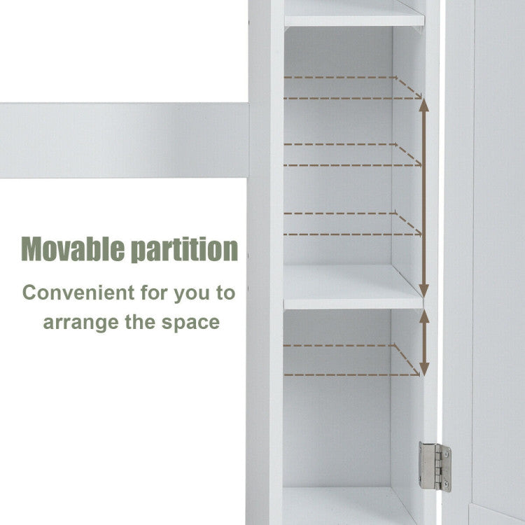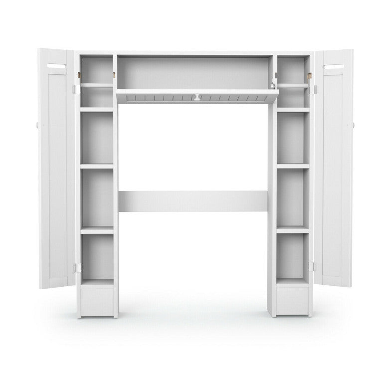 The generous center cabinets and two side cabinets allow you to organize and separate your personal products. There are a paper holder, one fixed shelf and two adjustable shelves behind each side cabinet. A pull-down door at the center is used for holding some bath items. The cabinet provides excellent storage solutions for bathrooms with limited space. This bathroom space saver features sturdy MDF construction, and its white finish ensures that it will match and accent any existing decor. It is a free standing furniture piece, which conveniently fits over standard toilet tanks and add easy storage for roll paper and other bathroom necessities.