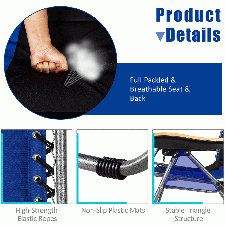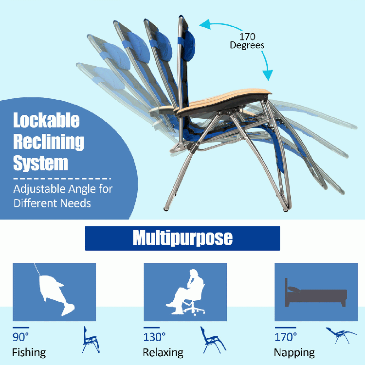 This heavy-duty lounge chair features a triangular support structure, which offers excellent stability for safe load-bearing. The reclining angle of the chairs can be adjusted at any angle from 0-170 degree. You can adjust to your most comfortable position whether lying or sitting. Ergonomic designs such as padded seat and back, a detachable pillow and curved armrests will provide you with extreme comfort and relieve stress. Whether you are camping or enjoying leisure time in your own yard, you are sure to relax with this zero gravity lounge chair.