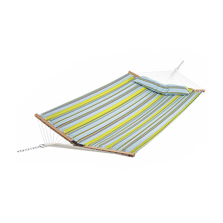 Made of high quality polyester fabric and curved beech wood spreader,this outdoor hammock features excellent durability and sturdiness for years to come. Thus you can use it with confidence. In addition,connected by rust-resistant steel connection and durable handcrafted cotton ropes,the hammock can hold up to 265lbs. With a portable design,you can fold this hammock into a compact size,which is easy to carry and transport. This premium porch hammock will be a perfect choice for indoor and outdoor use.