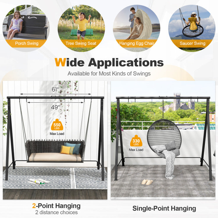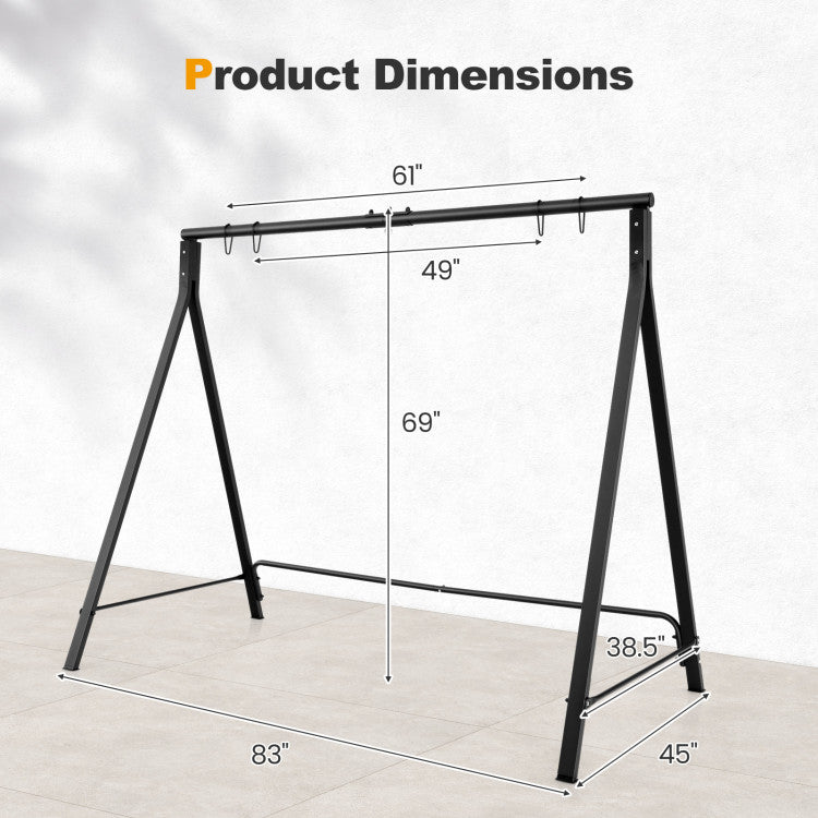 Heavy-Duty Metal Structure: This swing frame is mainly constructed of plastic-sprayed metal pipes, which are anti-rust, super sturdy and not easy to deform, ensuring high-level stability and long-time use. Solid A-Shaped Frame: Featuring A-shaped frame for added sturdiness, the swing stand will offer stronger support without any wobbling. Plus, the reinforced screw connection will highly strengthen the overall structure. Wide Applications: The metal swing stand with a suitable size is available for most kinds of swings, such as porch swing, tree swing seat, hanging egg chair, saucer swing and so on. And you can hang the swing in 2 ways: 2-point hanging or single-point hanging. Well-Made Details: The 5 sturdy hanging rings on the swing frame ensure high safety when you enjoy relaxing on the swing. Furthermore, the anti-slip footpads offer considerate protection to the ground. Effortless Assembly: With clear instructions and complete accessories, you can finish the assembly of this porch swing frame efficiently. Overall dimension: 83" x 45" x 69" (L x W x H).