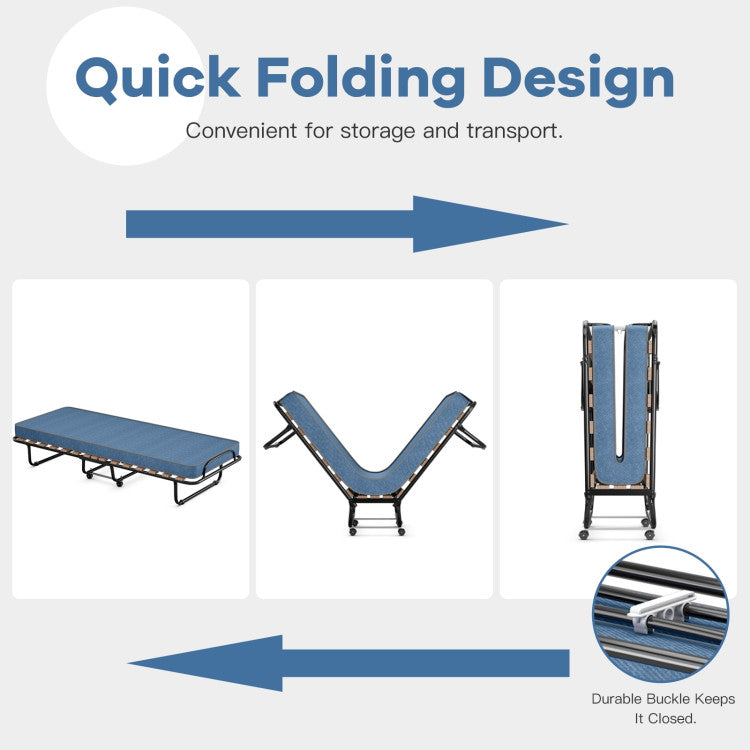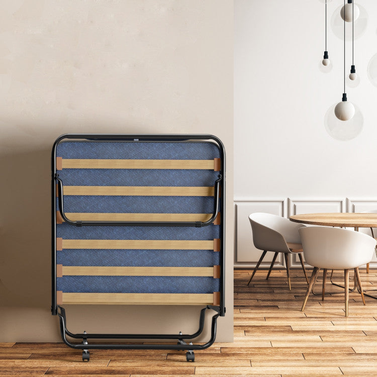 With a high soft and high-quality foam mattress, this folding bed gives you a cozy and comfortable feeling when you are lying. The sturdy metal construction with a dense slatted bar is strong enough to withstand a maximum load-bearing capacity of 440 pounds. What's more, this bed is perfect for limited space due to its folding design. And the all-directional wheels allow you to move and store it anywhere. It can be placed in the living room, bedroom, office, study room, and more places. Enjoy your leisure time with this upholstered bed!