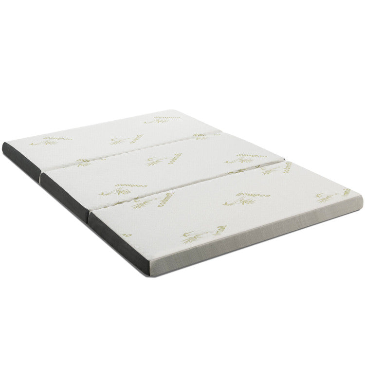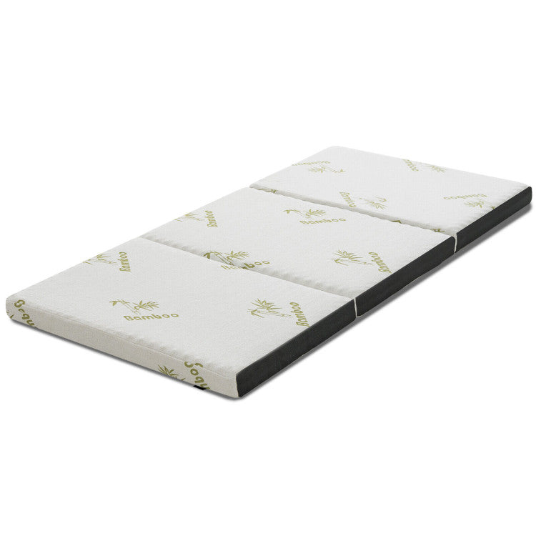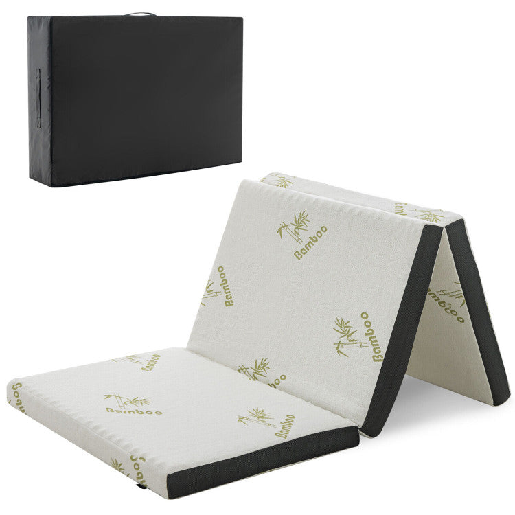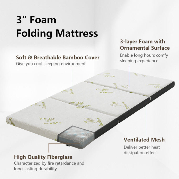 Designed with 3 layers all-foam system, the 3-inch folding mattress will give you quiet and deep sleep experience.The soft and breathable bamboo top layer regulates body temperature for cool night’s sleep. Additionally, high quality fiberglass is characterized by fire retardance and long-lasting durability. This mattress helps to relieve pain and reduce pressure points which make you feel refreshed and energized. More, you can unfolding the mattress, fold 1 or 2 sections and lean the rest against the wall to be used as a portable bed, lounger, sofa and extra seat. In addition, the carrying bag brings much convenience to transport and store, making it ideal for indoor and outdoor activities, including RV's, camping, and yoga, etc.