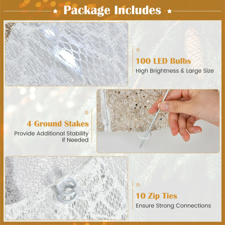 Measuring 5 ft in height and 100 LED lights, our lighted angel is an eye-catching addition no matter day or night. Crafted with weather resistant steel frame and tinsel, this Christmas yard decoration is capable for outdoor use. Besides, you can use ground stakes to fix this standing angel to the ground if needed. It is easy and quick to assemble with understandable instructions and zip ties. In addition, this artificial Christmas decor comes with an adapter with UL certification, which guarantees your safety while using. Our lighted angel is a perfect Christmas decoration, which adds a touch of festival to your home.