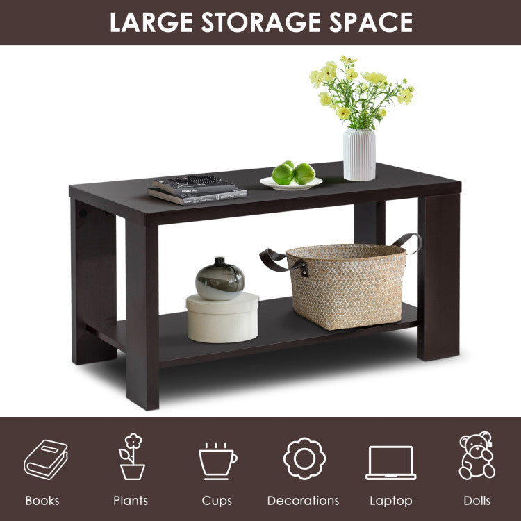 Constructed of high-quality engineered wood with premium melamine finish, this sofa table is stable, wear-resistant, heat-resistant, waterproof and easy to clean, ensuring a long lifespan. The table legs are equipped with non-slip foot pads to offer added stability and floor protection. Paired with an open shelf underneath the tabletop, the sturdy 2-tier cocktail table boasts roomy storage space for your favorite magazines, books, remotes, cups, vases, snacks and more. Moreover, the retro style and clean-lined design make this table the perfect choice for your living room, bedroom, office, reception room, etc.