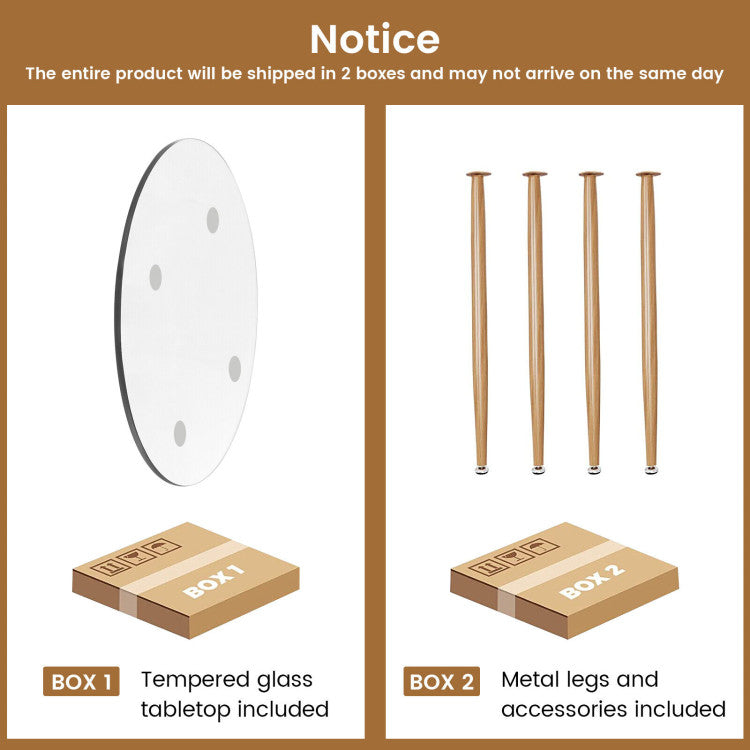 -Box 1: Tempered glass tabletop included, Box 2: Metal legs and accessories included