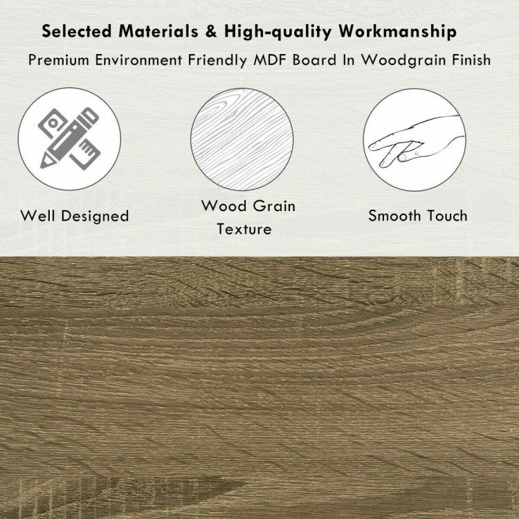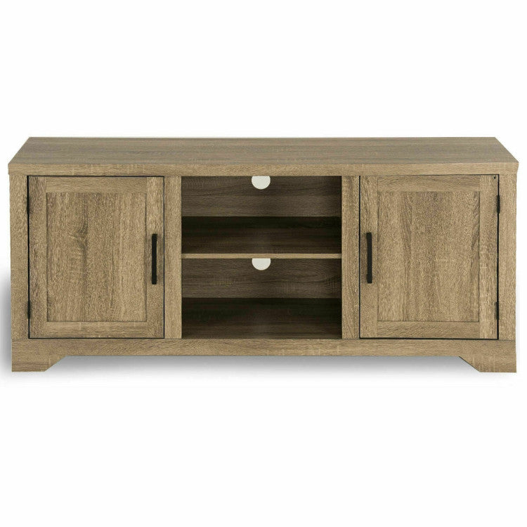 The top can support TVs up to 60 inches. It features a vintage wooden appearance, bringing modern style to your living room and blending well with any home decor. Made of premium MDF, this table is sturdy and durable, providing lifelong reliable use. This TV Stand features 2 cabinets with 1 adjustable shelf and two open adjustable shelves in the middle.