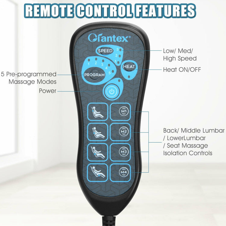 Its ultra soft plush cover feels luxurious and provides comfortable touch. Equipped with 5 massage modes, 4 selective massage zones and 3 intensity levels, it allows you to custom your own massage therapy according to your needs. In addition, it has 6 vibration motors with optional lumbar & seat heating function, which brings soothing warmth to the body while promote blood circulation, reduce muscle tension and deeply relive your lumbar pain. The massager can be used on a sofa, couch, recliner, or office chair to make the ultimate comfort seat in the house.