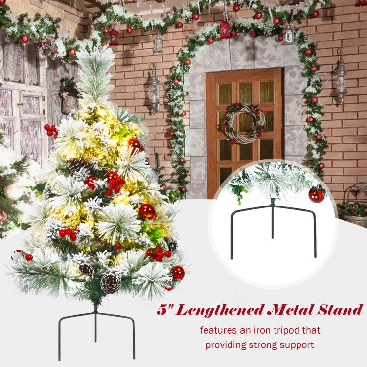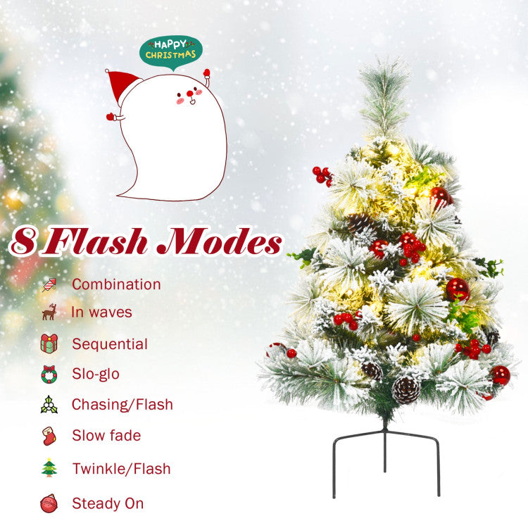 Made of high quality PVC material, these exquisitely crafted leaves with white floss will not fall off or fade easily. The solid iron tripod can be deeply inserted into soil, thus providing strong support. Besides, there are 6 pine cones, 12 red balls and 8 strings of berries on the tree. Powered by 3 AA batteries, this small artificial Christmas tree comes with 30 warm LED lights that have 8 flash modes. In addition, the battery powered design allows you to conveniently place these Christmas trees on the ground. With their elegant appearance, these pre-lit pathway Xmas trees will out of question be the focal point in your garden.