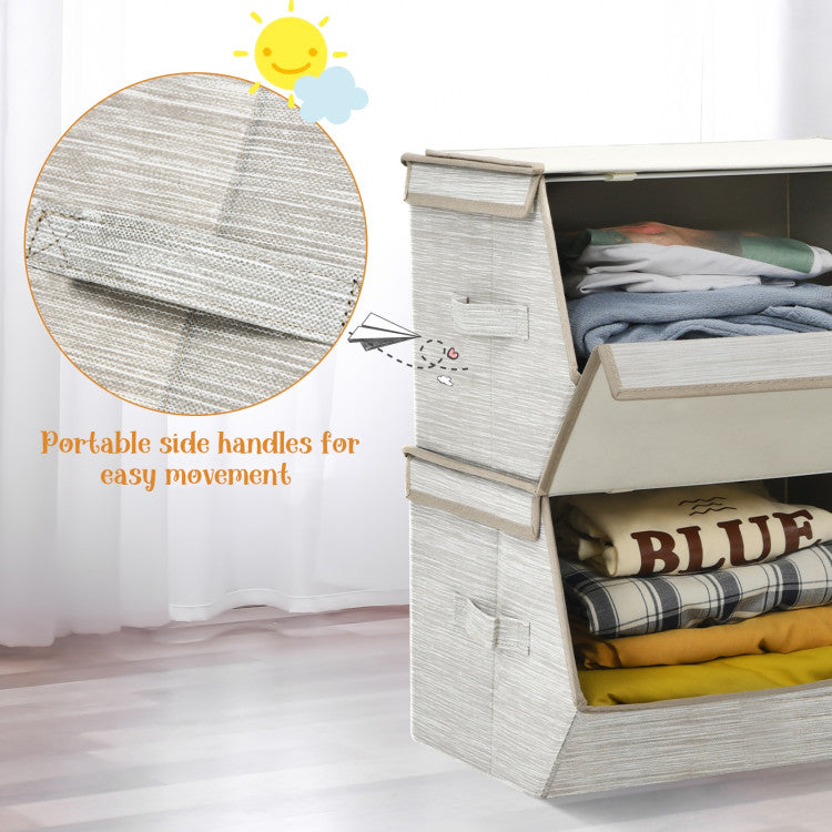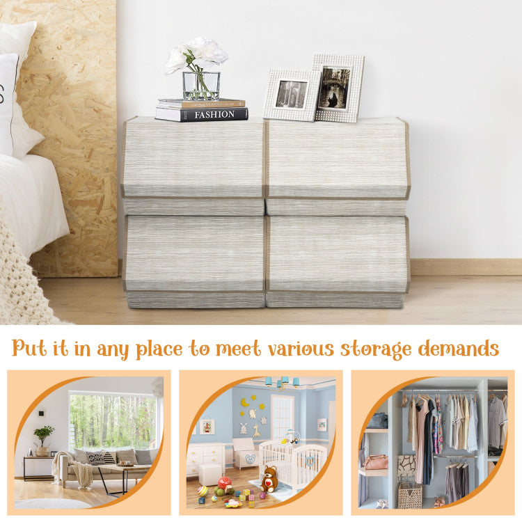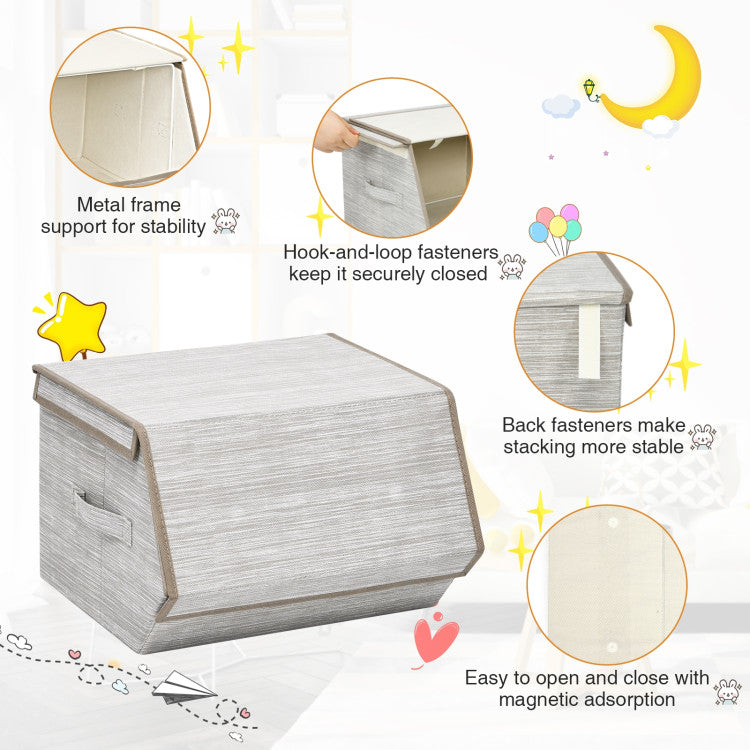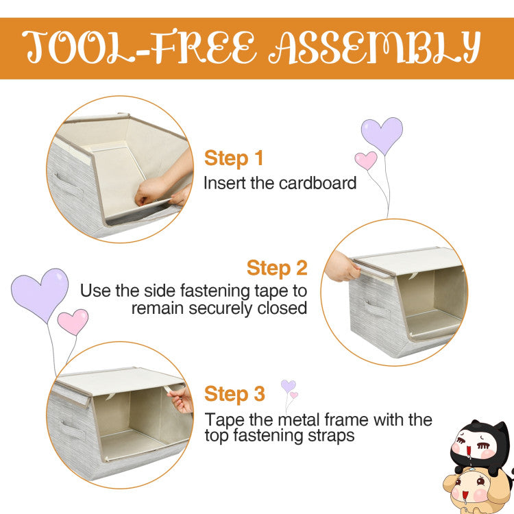 Keep messy items out of sight but within easy reach. These collapsible storage containers are perfect fit for shelf organizing, well organize the clutter, free up more space for your cabinet. You can use the hook-and-loop fasteners on the back to connect multiple boxes together to create a flexible storage space for any household items. Made of cardboard, non-woven fabric, and supported by a metal frame, the storage boxes can retain its shape even when stacked. The top lid is equipped with hook-and-loop fasteners to keep it securely closed and the built-in magnets make it easy to open and close the storage box and get items you wanted. Simply fold up when not in use to save space. The side handles make it more comfortable to hold and easy to move to different rooms.