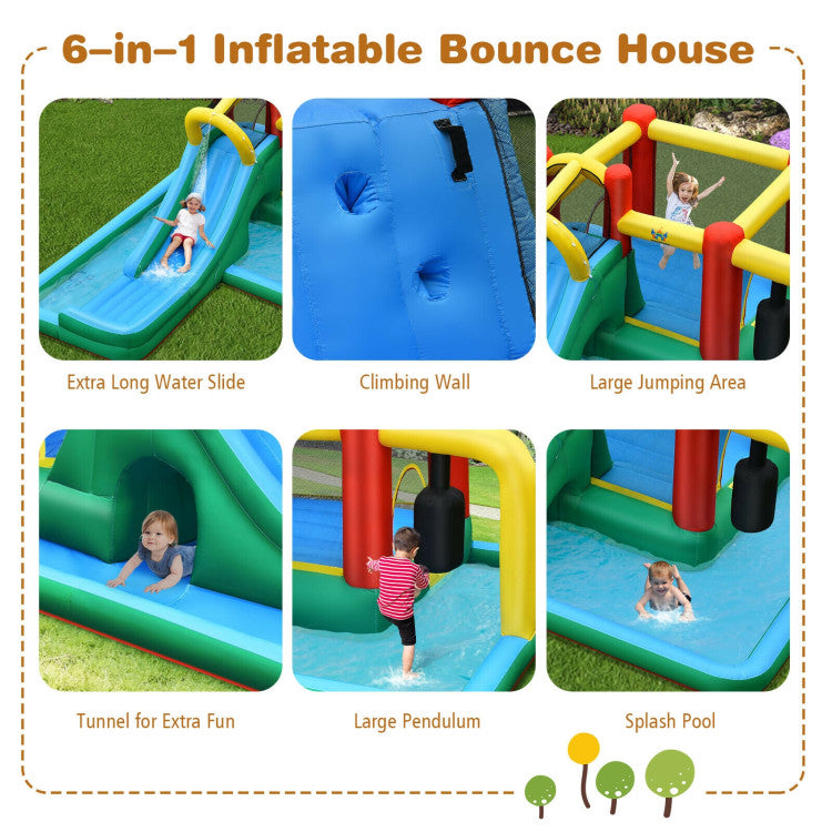 With an extra-long slide, a climbing wall, a splash pool, a tunnel, a pendulum, and a jumping area, your children will have hours of fun in different playing areas. And you can connect the hose to use this bounce house as a water park to add more fun on hot days. Made from non-toxic and durable oxford cloth material, this inflatable jumping castle is stable and secure enough for long-lasting use. It can hold up to 265 lbs and is suitable for 4 children to play together (Note: each child should be less than 66 lbs). As for safety, the breathable mesh netting wall will provide a safe playing environment for your children. And inflation is very easy, just to use a bower to set up the bounce house in minutes and fix it with ground stakes. The included storage bag makes it easy to store and take on the go. All in all, This inflatable bounce house can bring a colorful and happy childhood for your kids.