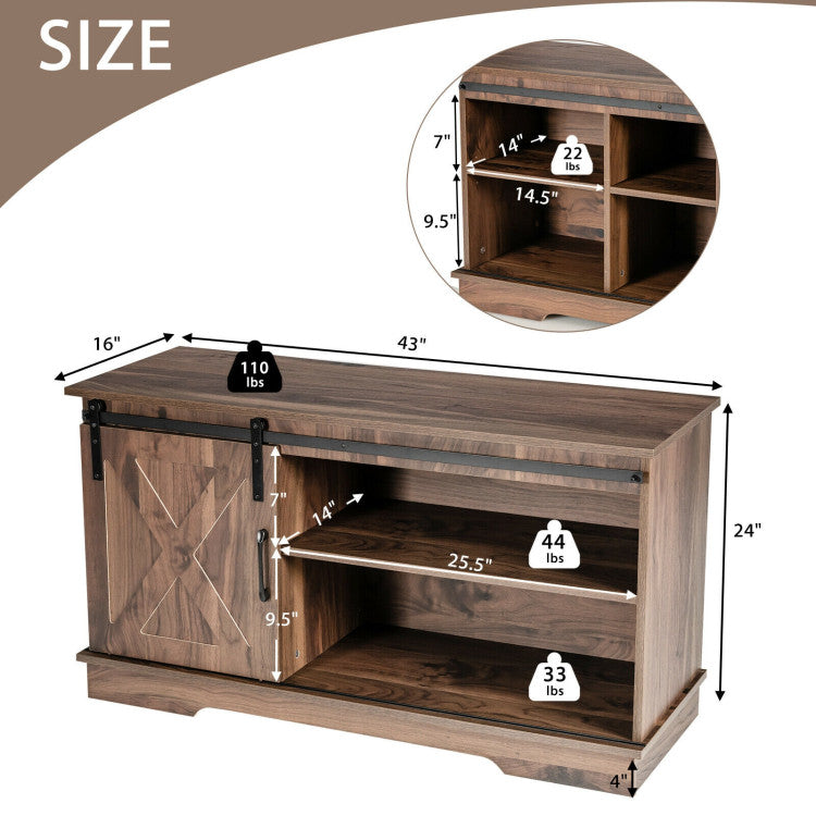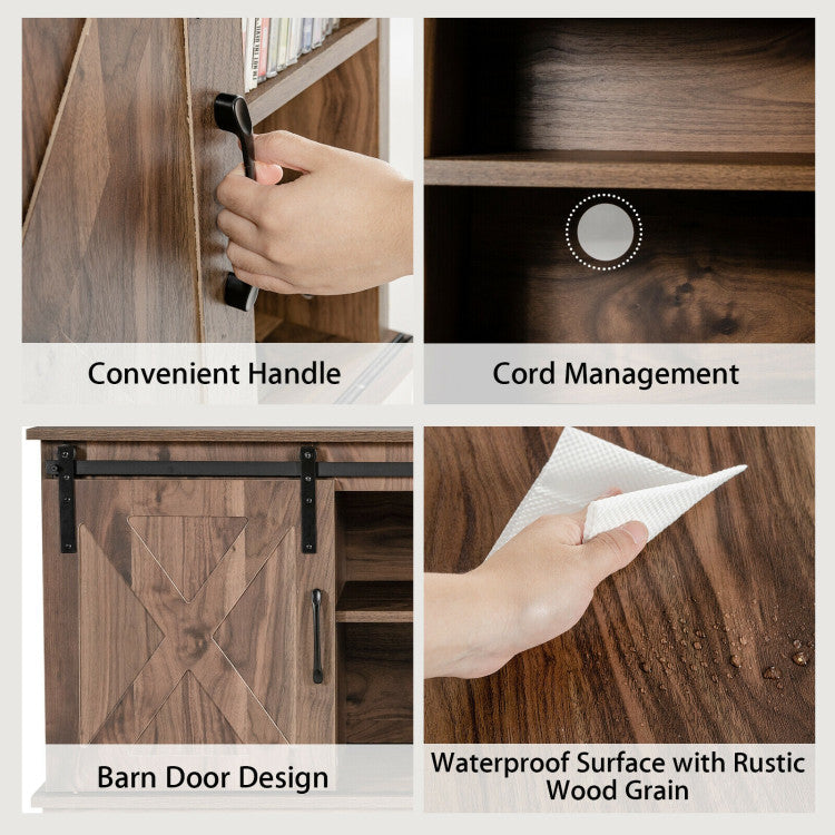 It is made of thickened wood-grain board, which is not only beautiful in appearance, but also has good durability and stability. This high-end entertainment center includes 4shelveswith a sliding barn door, which can be used to store media equipment, game pads, CDs, books or decorations. One of the shelves is adjustable in height, so as to fit different storage needs. And the wide countertop that measures 43" x 16" can hold flat screens up to 50". Therefore, it can be used as a TV cabinet in the living room, a storage cabinet in a bedroom, or a sideboard in the kitchen or dining room.