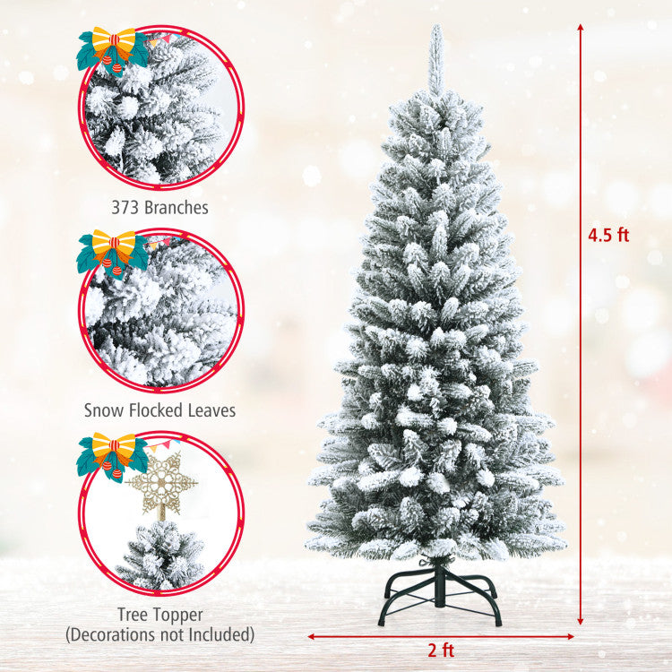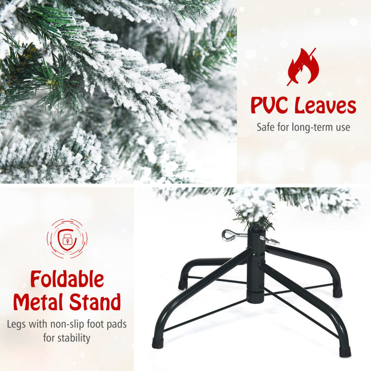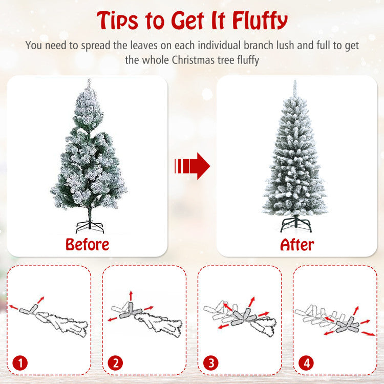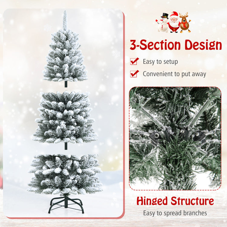 This snow-flocked Christmas tree is such a perfect decoration. Flourishing leaves with snow-flocked design create lush artificial tree in slim shape. And the different shapes of leaves reflect layered and lifelike appearance. Unfold the stand, install the hinged sections one by one, and fluff the branches carefully, how simple the assembly it is. Meanwhile, hinged sections and folding metal stand make it convenient to disassemble the tree for space-saving storage. Also the enhance metal stand offer a firm support to this upright tree.