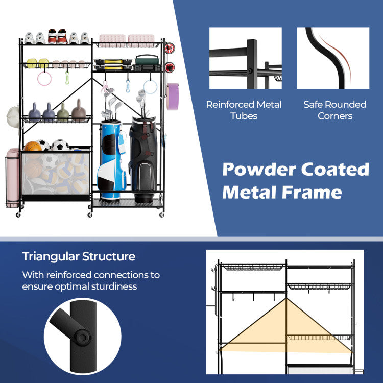 -All-in-one storage solution for different balls, golf bags, dumbbells, and yoga mats