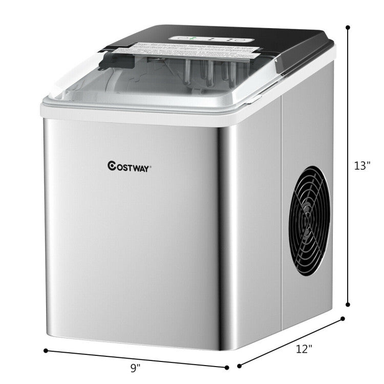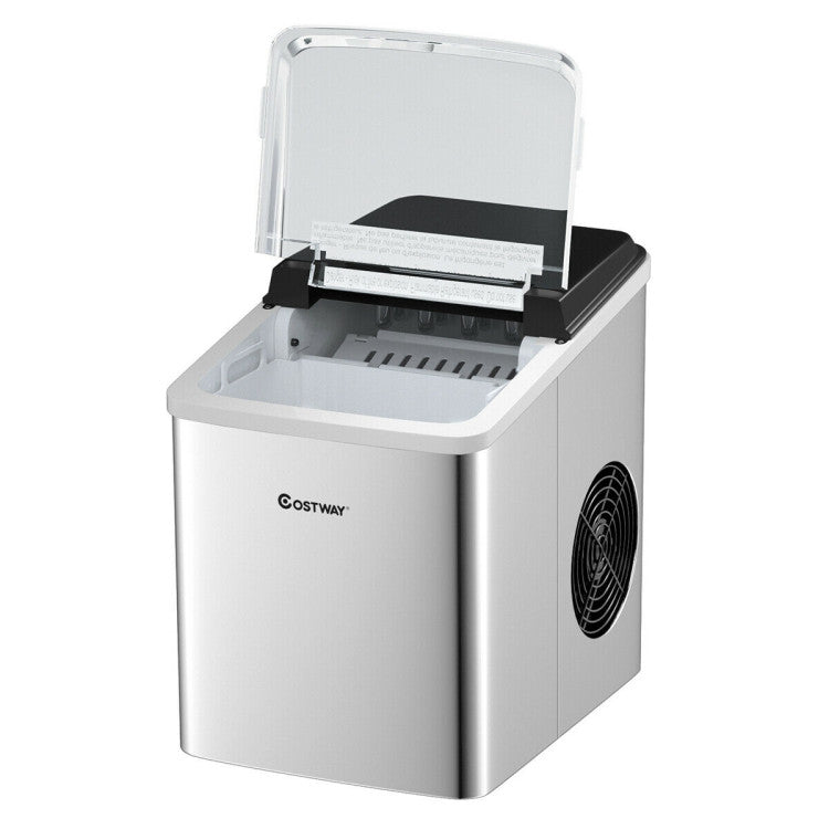 Featuring high efficient compressor and R600a refrigerant, this countertop ice machine has low noise, rapid cooling effect and low power consumption to make 26 lbs of bullet-shaped ice cubes per 24 hours. And 2 optional sizes of ice cubes can meet your different needs. It is made of food-grade ABS material with stainless steel finish for safe use. It is worth mentioning that the ice maker is designed with self cleaning function, which greatly facilitates your daily cleaning and maintenance work. Its compact size and light weight help to carry and store.